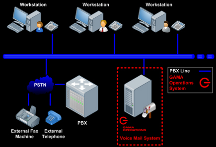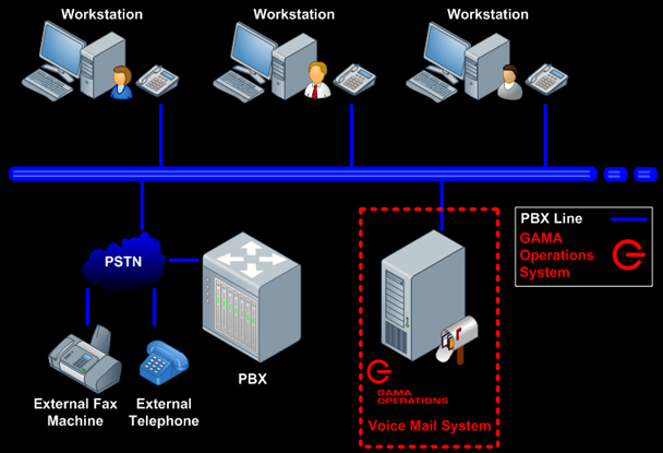 - GAMA Prime Voice system, Main PBX, Personal or department phone extension, External phone & Fax.